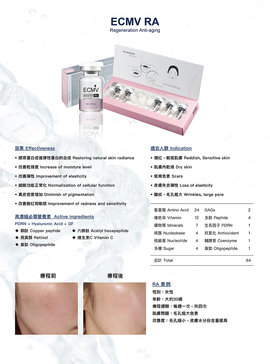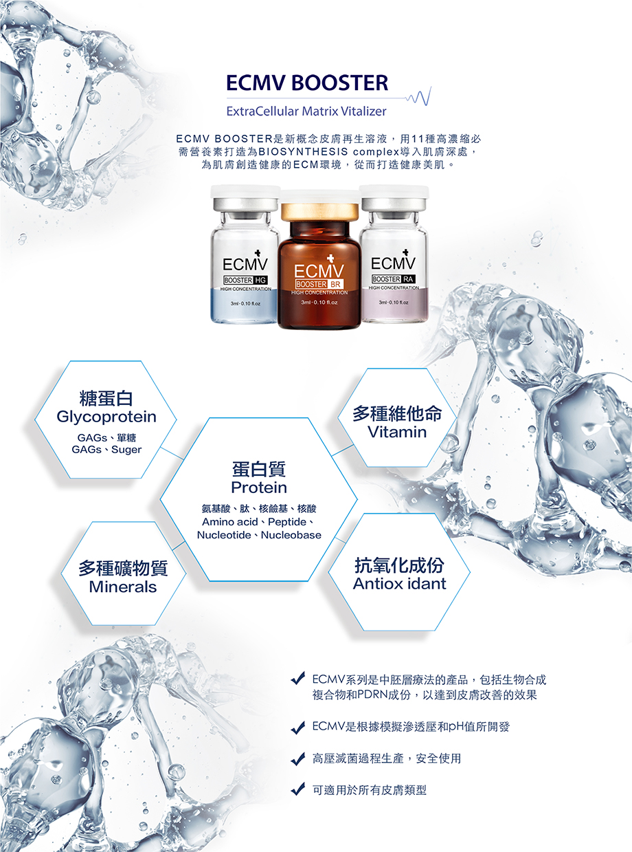 alt="ECMV BOOSTER是新概念皮膚再生溶液,用11種高濃縮必需營養素打造為BIOSYNTHESIScomplex導入肌膚深處,為肌膚創造健康的ECM環境,從而打造健康美肌。">